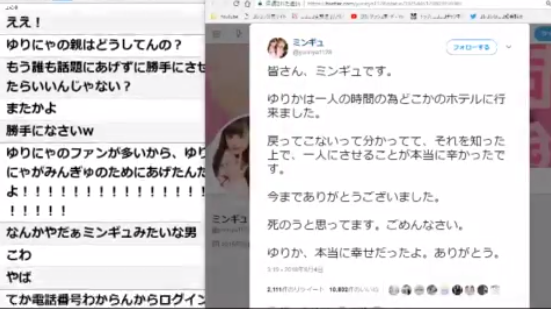 そして、ミンギュはまたもゆりにゃが不倫をしたことで自殺をする内容をつぶやいた。