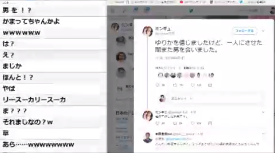 4日コレコレは仲直りしたゆりみん夫婦の不倫騒動は終わったかに見えたが、またもツイキャスで喧嘩していた情報が入った。ゆりにゃは別れたいと言っているのに全然ミンギュが話を聞かない。凶悪衝動があると言って怖い顔をして穏やかではない。